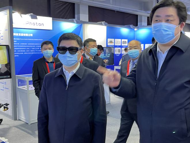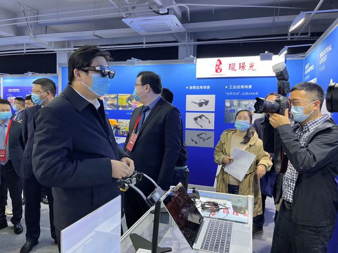 在现场,无锡市代市长赵建军、锡山区委书记周文栋在现场亲自佩戴体验了INMO Air AR智能眼镜并给予了高度评价。